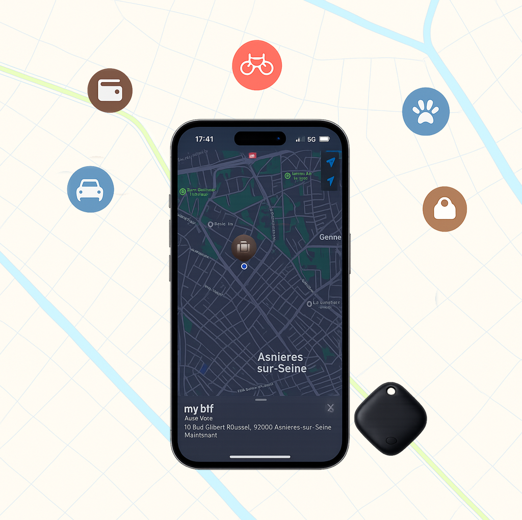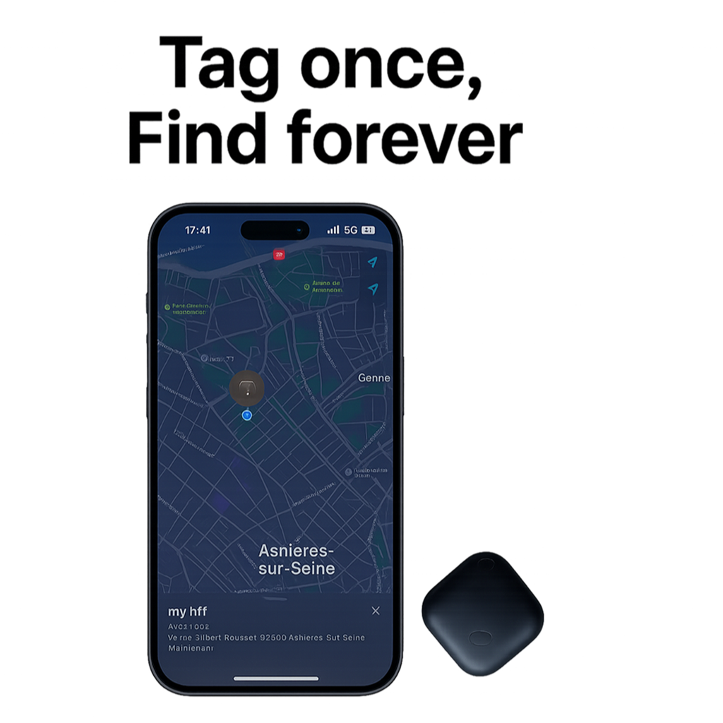 Fast Bluetooth pairing with the companion app (iOS 14.5+ / Android 9+). See your tag on a map, ring it, and set smart alerts.